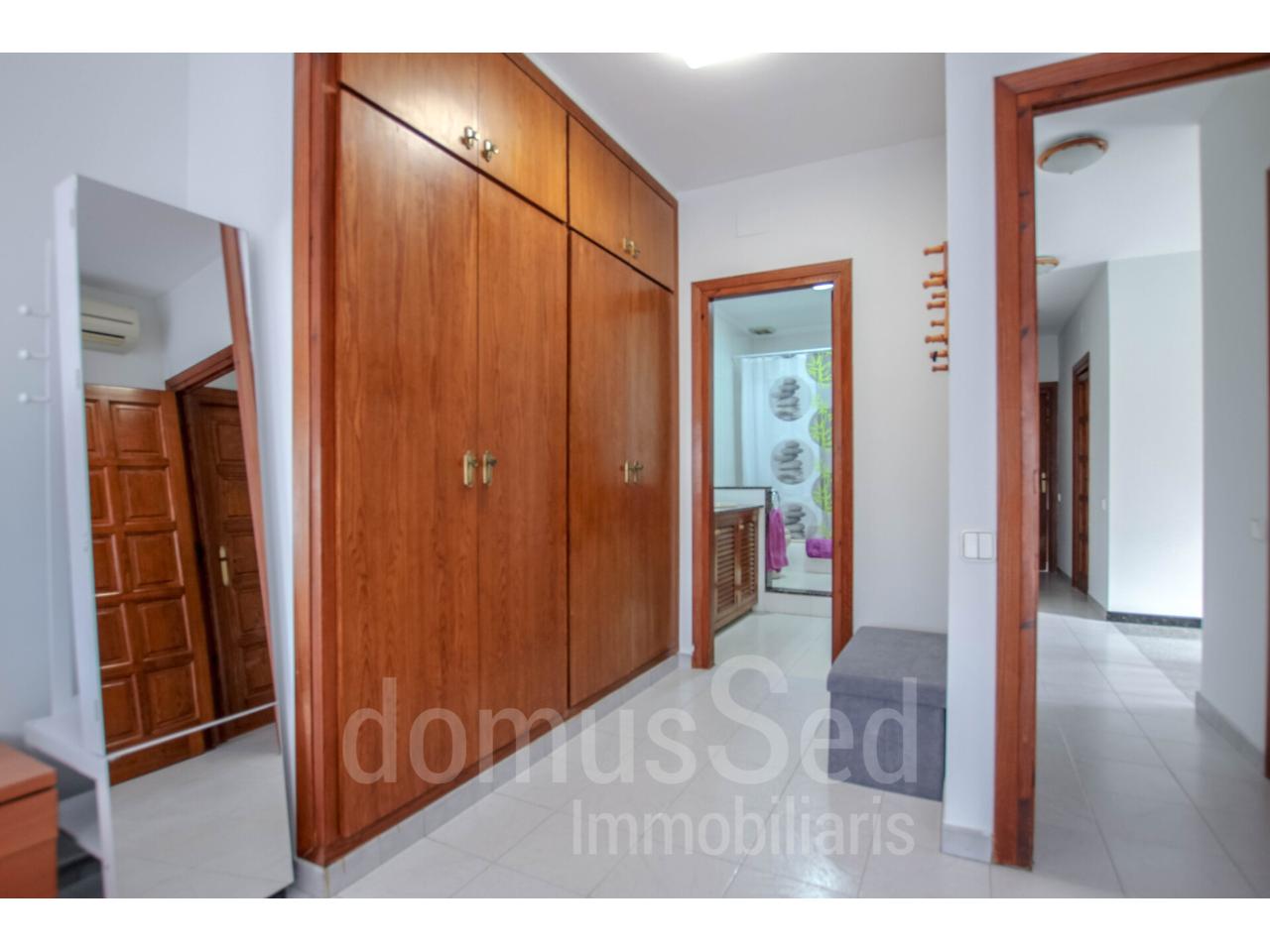 Al entrar encontramos, un vestíbulo muy amplio con unos armarios empotrados muy generosos que nos conduce, primero a una sala polivalente, un baño de cortesía, la cocina-office con su espacio para almacenamiento. Y a continuación pasamos al salón-comedor con chimenea, muy cálido y acogedor. Y desde esta sala accedemos a la parte exterior., donde pasamos a una primera terraza y a una segunda mucho más extensa, para después poder acceder a la zona de la piscina.